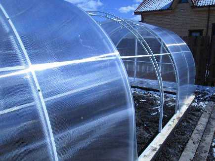 Ночные заморозки в апреле и мае пленка почти не держит: внутри столько же холодно, сколько снаружи. Поликарбонат — особенно сотовый, с воздушными камерами внутри — работает как термос, сохраняет накопленное за день тепло еще несколько часов. Для рассады это часто вопрос выживания.