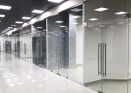Стеклянные перегородки часто применяются для демонстрации товаров. Они обеспечивают обзор продукции и создают ощущение открытости. Глухие панели используются для служебных зон или складских помещений внутри торговой точки.